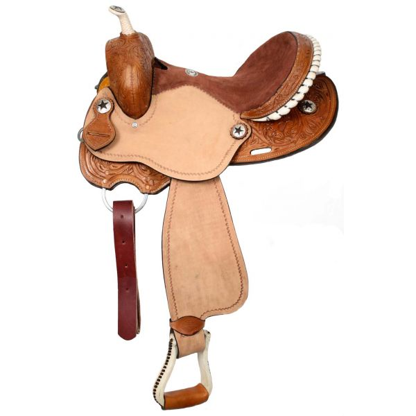 12" Double T Youth Barrel Style Saddle with hand floral tooling.