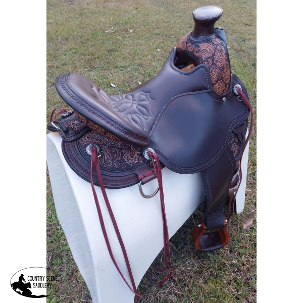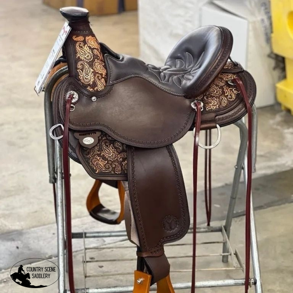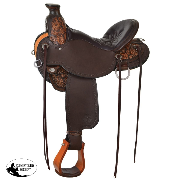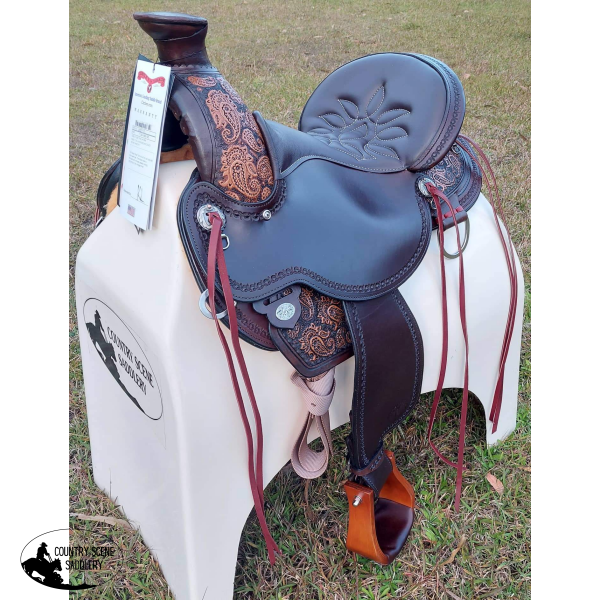 Paisley tooling accents the saddle, and a border is hand tooled to complete the look. The seat is comfortable and easy to clean, with impact foam covered in rich mahogany grainout leather. Six saddle strings are attached to easily tie on gear or use the dee rings around the saddle.