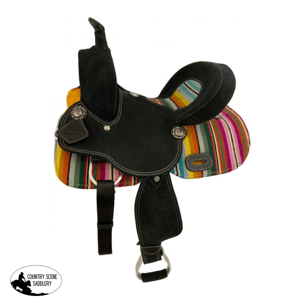 12" Double T Youth black roughout barrel saddle with wool serape saddle blanket inlay and skirts. This Double T hard seat barrel style saddle combines comfort, function, and fun. The roughout dyed black leather seat, jockey, pommel, cantle, and fenders are accented with bright, wool serape saddle blanket skirts and inlayed seat. Constructed on a rawhide wrapped fiberglass wood tree, it is built to last with semi quarter horse bars. Light weight design with a bicycle-style seat and wool insert so comfort and function are a guarantee. Classic antiqued silver conchos and aluminum stirrups with suede bottom are the perfect finishing touch.