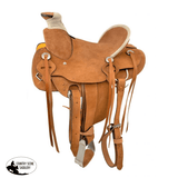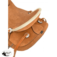 13" Wade Style Rough Out Youth Saddle with rawhide accents. This saddle features an all over medium rough-out, accented with rawhide. This saddle is equipped with aluminum stirrups with leather tread, cowboy tie accents, back rigging, leather tie strap and off billets. This saddle has a Wade Style Roping tree but is NOT GUARANTEED FOR ROPING.