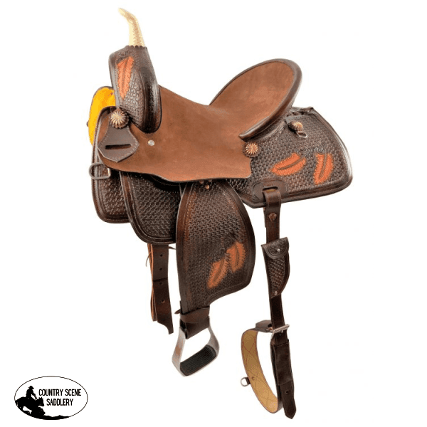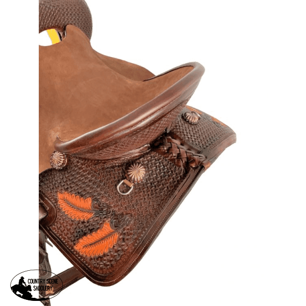 15" Hard Seat Barrel style western saddle with Basket and feather tooling. This Dark Oil Saddle features a basket stamp tooling accented with light tooled feathers. Features a rough out hard seat with pencil roll and rounded corners on the skirt. Saddle comes equipped with front D rings, leather latigo tie strap, off billets, aluminum padded stirrups, and a back rigging with hoof pick holder.