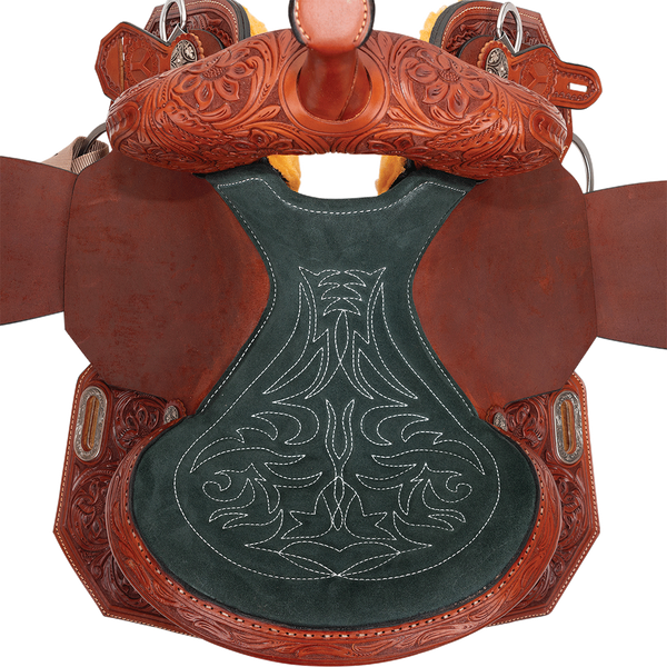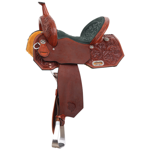 The Bonnie Barrel Saddle is part of the Cobra barrel saddle collection that offers our deepest seat. With a 5” cantle and 15” swells, this saddle provides barrel racers with the secure and safe feeling they need to take a deep seat on a fast, powerful turning barrel horse. The beautiful chestnut-dyed leather comes alive with the Arizona floral hand tooling and a comfortable quilted suede seat that is hand-stitched. Choose between an earthy hunter green suede seat or a sleek jet-black suede to match your energy and set the tone for your ride. The in-skirt rigging helps reduce bulk under your legs while evenly distributing pressure and balancing the saddle across your equine athlete’s back. Stay in sync of your run in the Bonnie barrel saddle. Getting the right fit for your horse is just as important to us as it is to you. Here’s what we generally recommend: • Regular tree fit: Ideal for horses with more defined withers. • Wide tree fit: Perfect for horses with a foundation build and rounder withers.