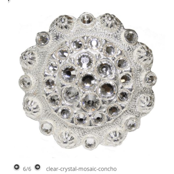 Saddle pictured in Regular color, also available in Ultra Lite if you prefer a lighter finish. Either way, this saddle is gorgeous! Sparkling clear crystal conchos and also across the cantle for a pretty look with stainless steel hardware. Nylon tie straps. Rawhide stirrups.