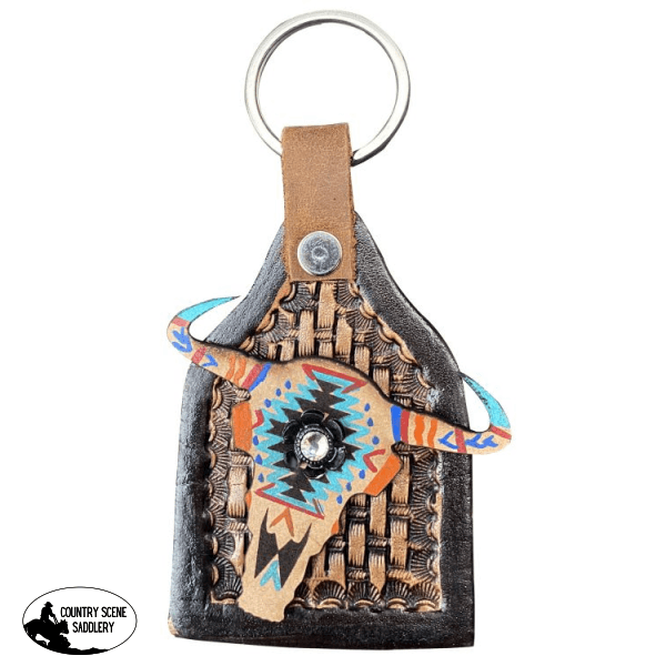 177927 Showman ® Cow tag shaped Aztec cow skull keychain