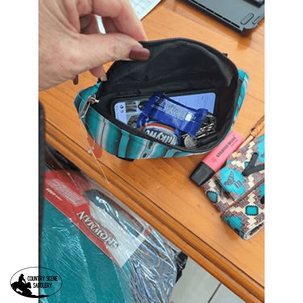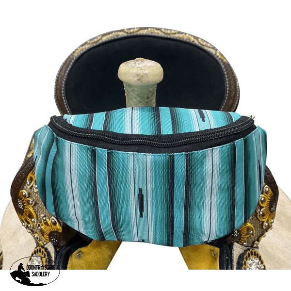 Showman ® Southwest Print Insulated Nylon Saddle Pouch. Includes two convenient pockets that are ideal for your phone, keys, money, snacks, etc. Simply clip the saddle pouch to the pommel of your saddle with two buckles. Measures 8.5" long by 3.5" wide by 4.5" tall.