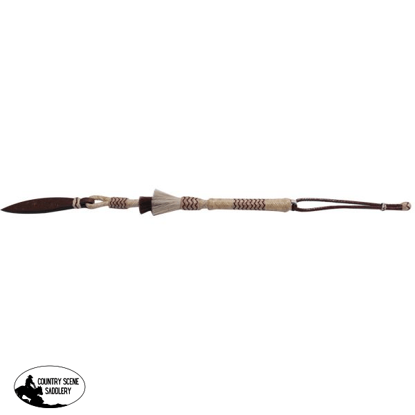 Showman ® 29" Braided rawhide quirt with horse hair and leather popper. This quirt is made of braided rawhide and is accented with two toned horse hair and a tooled leather popper end.