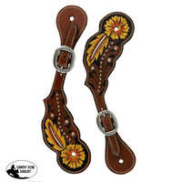 These spur straps feature medium brown leather with a painted yellow flower and feather design with silver beads and rhinestones.
