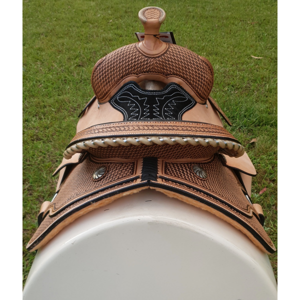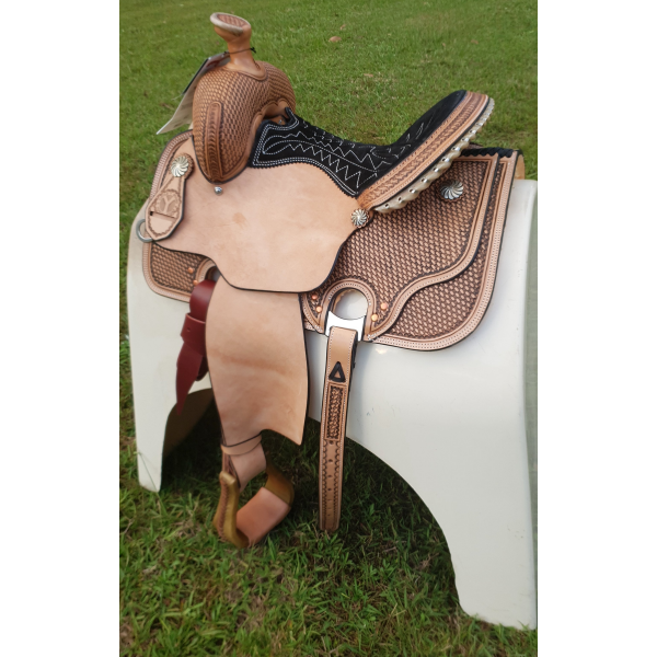 All around saddle strong enough to rope in or lightweight to do any gymkhana event. The 2164 Cheyenne has an antique finish with black suede quilted seat and iron pinwheel conchos. Matching rear cinch seat included.