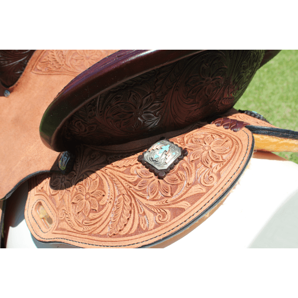 This one-of-a-kind saddle combines classic Western style with high-performance features such as our ALL-NEW Cobra tree, which provides our most aggressive, locked-in feeling seat yet! Its hand-tooled 1/2 Texas Flower tooling, combined with a roughout design, and 7/8 in-skirt rigging provide stick and stability in the arena. The 2234 Great Oak Barrel Saddle features the custom Circle Y Silver Thunderbird conchos to provide a subtle pop of color. Give the Great Oak Barrel Saddle a try for an unforgettable riding experience in and out of the arena!