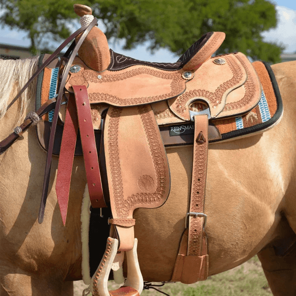 It's time to give those jack of all trades riders a saddle all their own. Packed with features to assist in a wide array of events. Secure feeling seat for speed events like barrels and poles, wrapped horn for calf roping, and complete with baby powder holder on the billet for breakaway ropers. The Odessa All Around has a sharp but subtle look with its all roughout leather and classy hand tooled border. Cream-colored quilting on the chocolate suede seat.