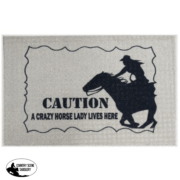 27" x 18" 'Caution, A crazy horse lady lives here' Welcome mat. This welcome mat features a screen printed horse and rider on a carpet material.