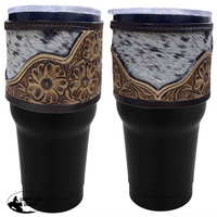 30 oz Insulated Black Tumbler with Argentina Cow Leather Cowhide Inlay Sleeve. This insulated tumbler with lid features an Argentina Cow leather removable sleeve. Light oil floral tooled Sleeve features a hair on cowhide inlay.