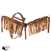 7079 .Showman ® PONY Hand painted sunflower headstall and breast collar set with fringe. This set features hand painted sunflowers on the breastcollar and headstall, copper conchos and studs, and mustard yellow suede leather fringe. Headstall comes with 6ft leather split reins.