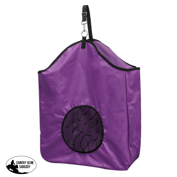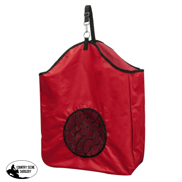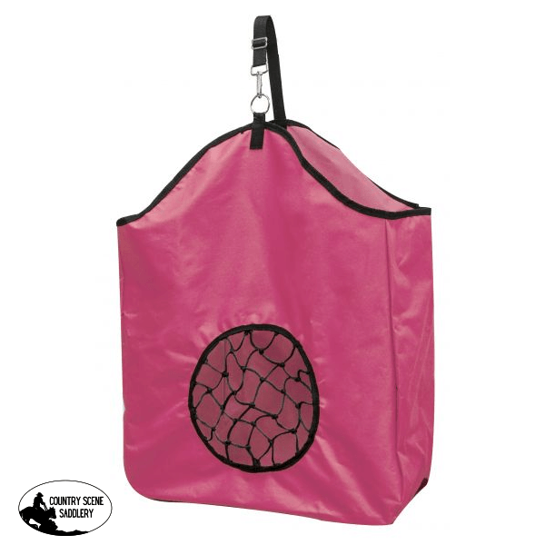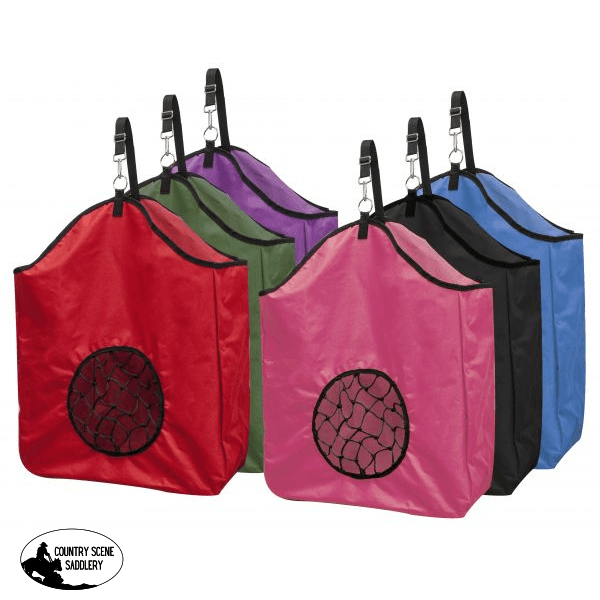 Showmanย ยฎ nylon slow feed hay bag.ย Adjustable nylon strap with nickel plated snap. Measures 20" x 21" with an 8" gusset and a " round net.