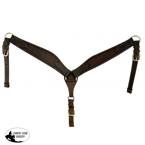 This breast collar features a Dark Oil Argentina cow leather tooled leather contoured design with basket tooling and 3/4" leather tugs. Measures approx. 3 1/2" wide at widest point.