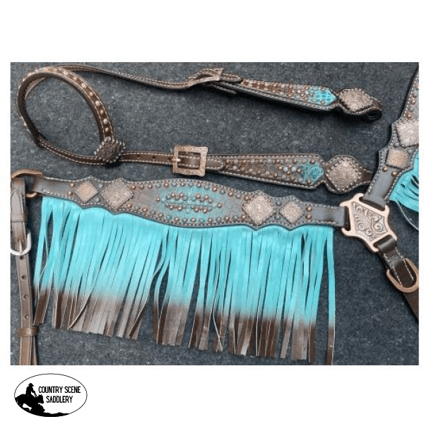 Showman ® Teal / Brown Ombre Fringe tooled leather Headstall and Breast collar set with gator accents & beading. This set features a dark colored leather with dark brown / teal gator overlay. Accented with gold and turquoise beads. Adorned with antique copper engraved conchos. Set comes complete with 5/8" x 7' split leather reins.