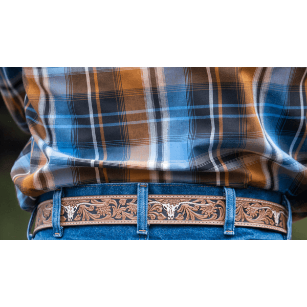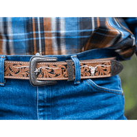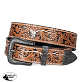 Unisex Leather 3 Shade Belt - Floral Embossed - with Tooled White Longhorn - Removable Buckle