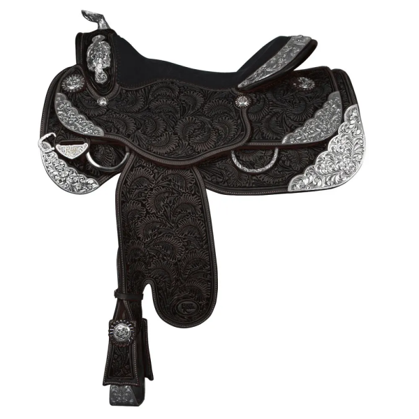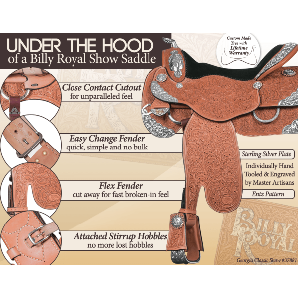 Billy Royal showcases its long standing tradition of quality handcrafted Western show saddles. Crafted from the finest, hand selected hides, hand tooled to perfection in an Oak leaf/acorn pattern and complemented by hand engraved 92.5% sterling silver plate trim. Our custom made trees are lifetime warranted and are built with a Full Quarter Horse bar to accommodate the conformations of today’s modern breeds.