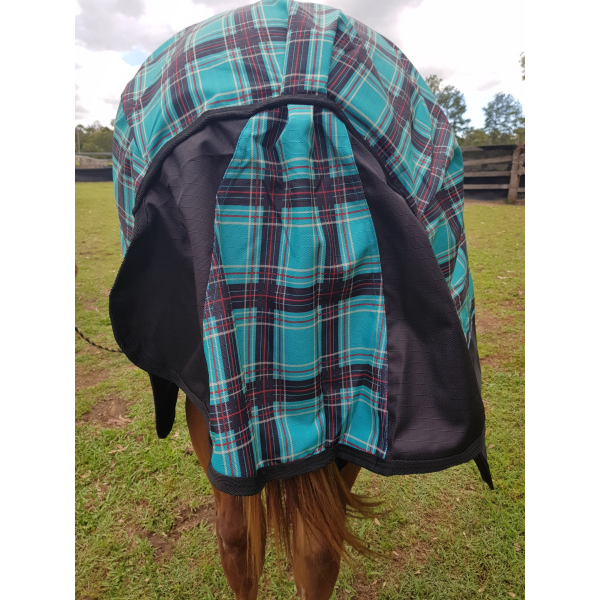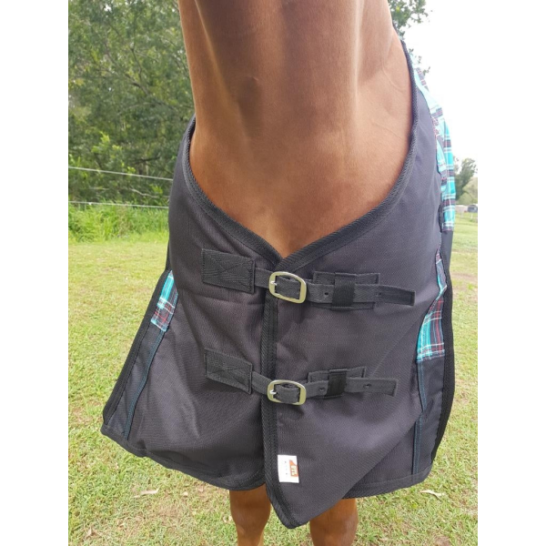 NOTE: NO FILL Super breathable, water resistant synthetic combo. 1200 denier, with large hole mesh insert, which has a wick away effect on the horses body allowing them to stay cool. Very lightweight and includes cross over belly bands and good quality fittings & Large tail flap.