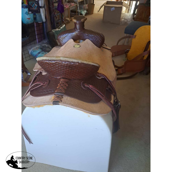 - Basketweave and meander tooled dark oil pommel, skirt, off billet and back rigging.