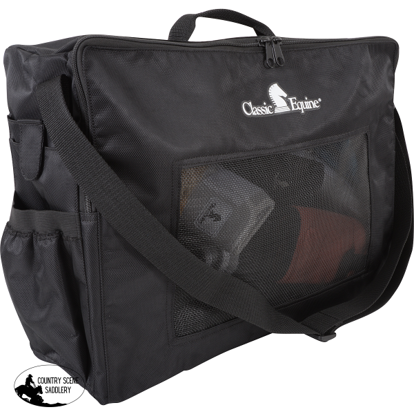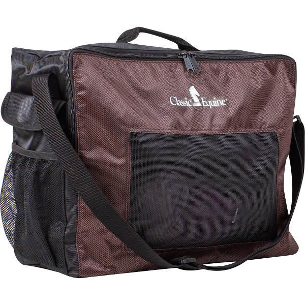 The Boot/ Accessory Tote is just the right size for carrying all of you and your horses’ most essential items. Constructed with convenience in mind, it has mesh on all sides and on the bottom of the bag to not only allow dirt and odors to escape, but to also let your splint boots and bell boots air out and breathe during storage. In addition, there are six pockets of various sizes on both sides of the tote for your cell phone, water bottle, keys and a snack. Tough nylon handle and adjustable shoulder strap provide convenient handling and carrying. Specifically designed to carry your splint boots and bell boots when then they aren’t on your horse. Size: 19″ x 18″ x 6″.