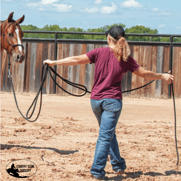 This 23′ premium black lunge line is firm yet flexible to allow excellent control with virtually no stretch and weighted feel for increased sensitivity. Colorfast and UV resistant. Equipped with bull snap for easy attachment and leather popper on the end. 23 foot black premium lunge line, with a leather popper and a bull snap. Colorfast and UV Resistant.