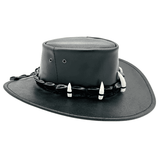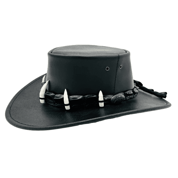 Crikey! The Jacaru Croc Hunter hat is as fearless and tough as those who wear it. Made from quality cow leather and bound with fair dinkum crocodile leather and teeth band. This hat really doesn't need explaining.