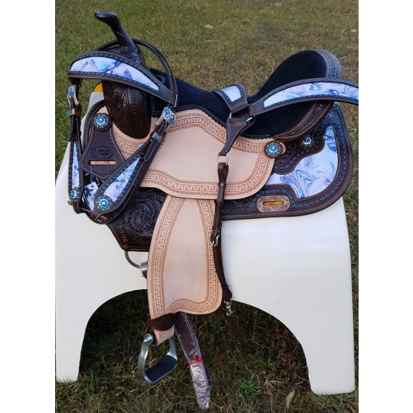 This particular setΒ was Saddle,Saddle Pad,Boots,n bells Latigo n Billet Set,Stirrup Irons and Matching compression hoodΒ Bridle and BreastplateΒ ASK US this can be done forΒ all our patternsΒ :)Β