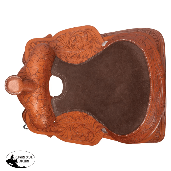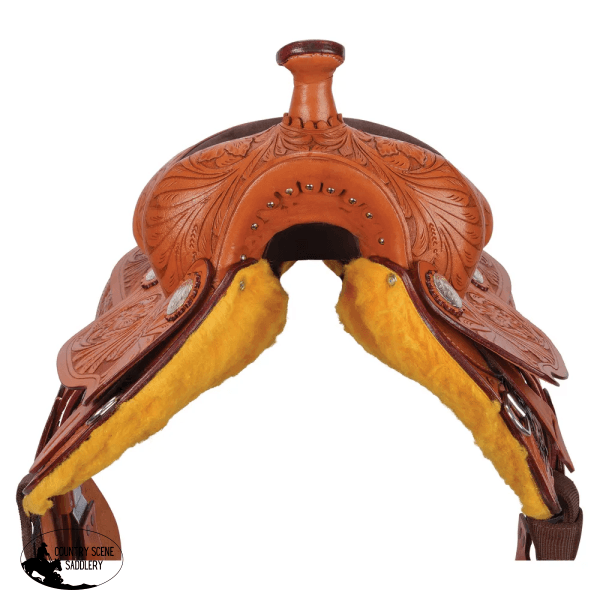 This is an outstanding entry-level western saddle for young riders at an amazing value and features a beautiful floral tooled crafted leather with silver plated accent conchos. The comfortable hand-shaped padded seat offers balance to help your kid stay secure while riding. The full horse bars fit a variety of withers, plus this saddle is built on a lightweight fiberglass tree with close contact skirting.