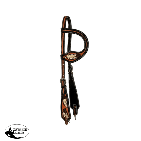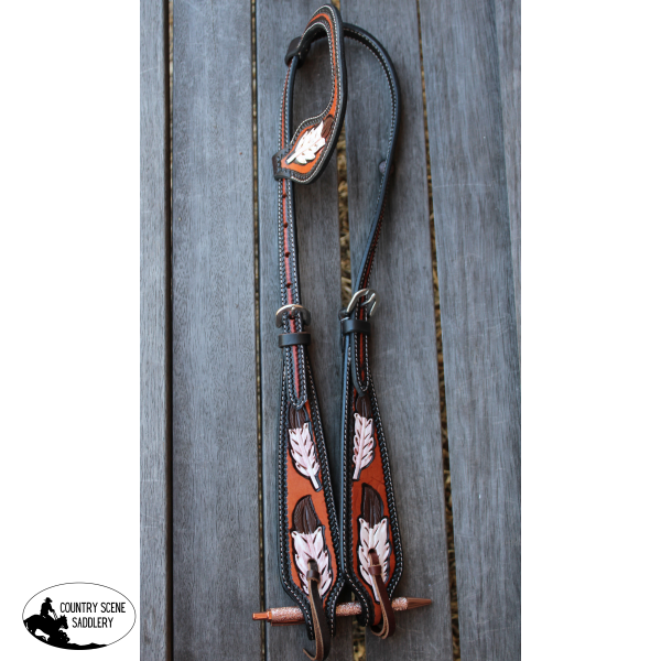 This headstall features dark Argentina Cow Leather with a painted feather design on one earpiece. Features cowboy tie loops. REINS NOT INCLUDED