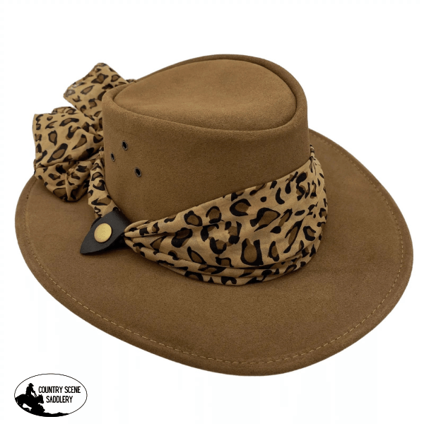 The Jacaru 1020 Jillaroo is a beautifully made cow hide suede hat with a chiffon scarf around the crown. The leather has a UPF 50+ rating and is water resistant making it great for all weather. Handmade in Australia.