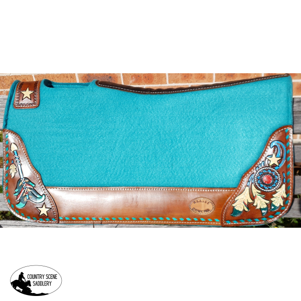 Klassy Cowgirl 28x30 Barrel Style 1” Teal felt pad with teal lacing and painted feather design. This beautiful pad features a distressed brown leather with teal lacing, and painted feather design. This saddle pad features a 1" heavy duty teal felt with vented wither and leather reinforced spine.