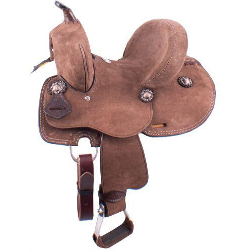10" Double T Youth Hard Seat Barrel style saddle with extra deep seat. This saddle is rough out brown in color and is accented with copper colored conchos and aluminum stirrups. Saddle comes equipped with front D rings, leather latigo and off billets.