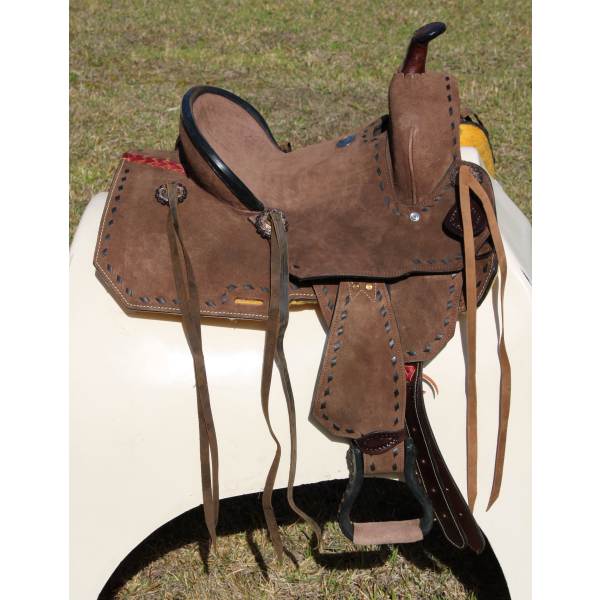 10" Double T Youth/Pony Chocolate Roughout Barrel Saddle. This sadde features roughout fenders and jockies with a buckstitch and roughout seat. Accented with antiqued copper conchos and rawhide covered stirrups. Saddle comes equipped with front D rings, leather latigo and off billet.