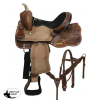 12" Double T pony saddle set with floral tooling. This saddle features light oil with floral tooling. Saddle comes equipped with leather latigo and off billet. Headstall and breast collar are accented with floral tooling and engraved conchos.