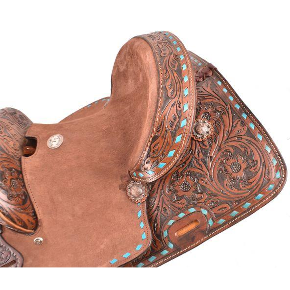 This saddle features chocolate rough out leather hard seat, fenders, and jockies with floral tooled leather skirt, cantle and pommel. Fenders feature a floral tooled leather overlay in corner. Accented with turquoise buckstitch trim, and copper conchos. Saddle comes equipped with front D rings, leather latigo, off billet, and turquoise rawhide laced stirrups.