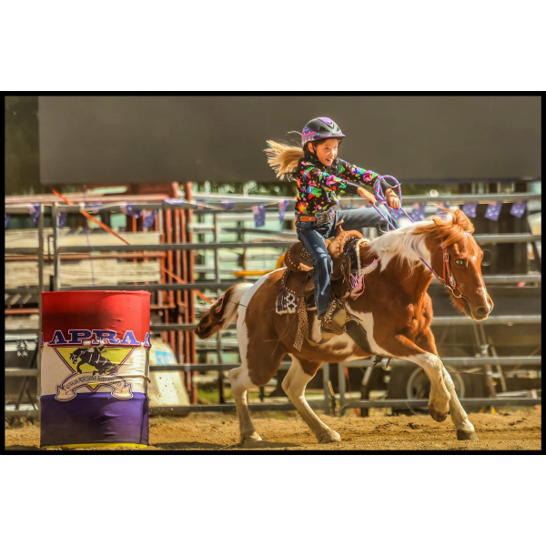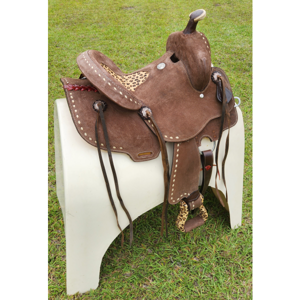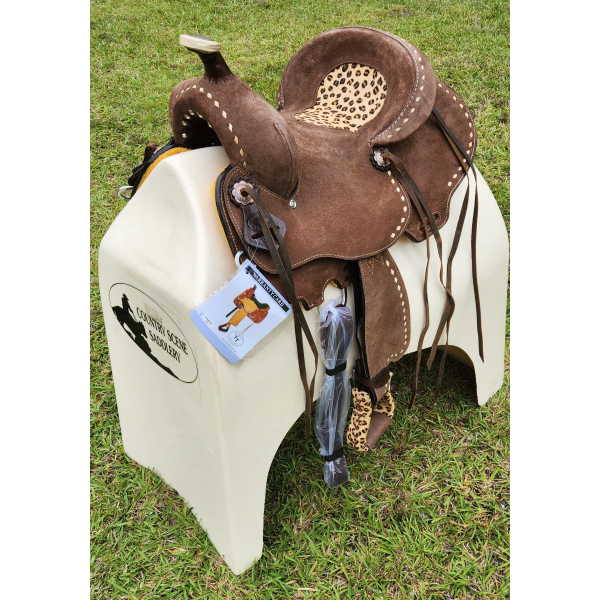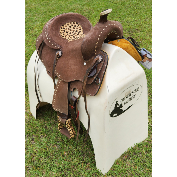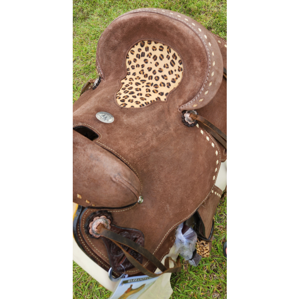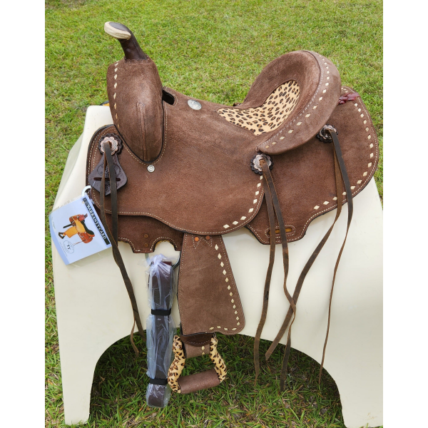 13" Double T Youth Hard Seat Barrel style saddle with Cheetah Seat. This saddle is a rough out brown in color and features a cheetah print inlay in seat. Saddle is accented with natural buck stitch trim and copper colored conchos with cheetah print stirrups. Saddle comes equipped with front D rings, leather latigo and off billets.