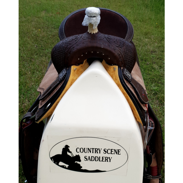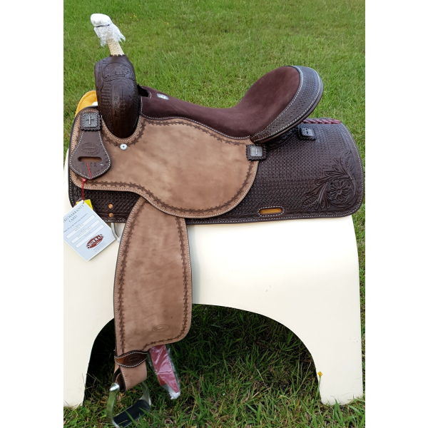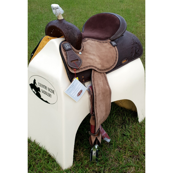 15",16" Showman™ Argentina Cow Leather Barrel Style Saddle.This saddle features square tooling on skirts and pommel and cantle with medium color rough out jockeys and fenders. Brown suede seat.Skirt corners are accented with floral tooling. Saddle is accented with barbwire tooled borders and engraved cross brushed nickle conchos.