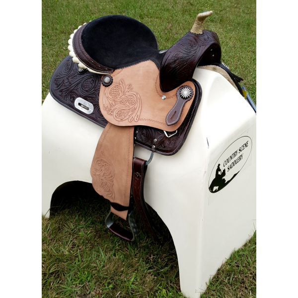 This saddle features black suede leather seat. Rawhide braided horn and a silver laced rawhide cantle accented with basket weave tooling. Roughout fenders and jockies feature filigree and basket weave tooling. Engraved silver stirrups feature medium leather grip tread.