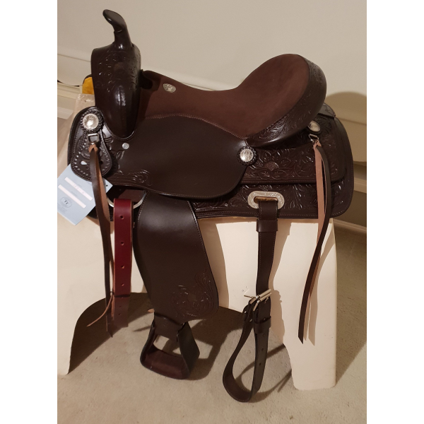 16", 17" Double T Pleasure Style Saddle. This saddle features smooth leather pommel, cantle, fenders and jockeys accented with floral tooling. Fully tooled skirts. Saddle is accented with engraved silver and leather strings. Saddle has engraved silver accents and conchos. Saddle comes equipped with back cinch. Made by Double T Saddlery.Model #: 12716