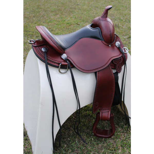 The 1667 Salt River Flex2® is great choice for a trail saddle because of the comfort features for you and your horse. The round skirt is a great option for short backed horses and to reduce weight. It’s uses our most popular Flex2® trail tree which has a 4″ cantle and 13″ wide swell to provide a moderate seat, the standard in all-day comfort. The 3-way in-skirt rigging lets you choose which rigging position best suits your horse. Impact Foam™ in seat keeps you comfortable all day in the saddle with leather laced stirrups for extra comfort. ErgoBalance Stirrups™ tilt the stirrup to eliminate the torque on the rider’s knees and ankles for increased comfort and promote balanced riding. Engraved stainless steel conchos resist rust. Available in regular or wide tree widths; choice of walnut (shown), regular oil, or black finish.