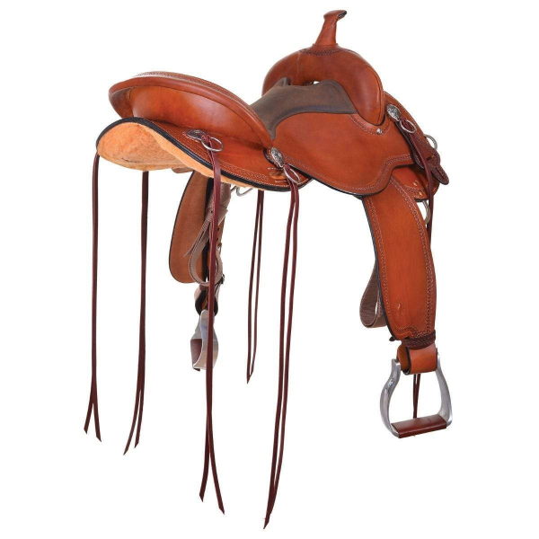 This best-selling Circle Y Trail saddle features a unique tree fit designed specifically for the foundation style horse that needs a wider fit from the shoulder to the loin. Wood tree is fiberglass reinforced and DURAhide™ coated which locks out moisture and adds another layer of strength to the tree adding to the longevity of your saddle. It has a close contact round cut out skirt design for precise cueing, Tunnel Skirt™ design to eliminate spinal pressure, 3-Way rigging for multiple rigging options, convenience rings, pre-shaped fenders with metal stirrups, and Impact Foam™ seat for all-day comfort. Apache leather seat has some grip for a great rustic look. Engraved stainless steel conchos resist rust with six sets of strings and extra rings to tie your gear; deep walnut or rich regular oil finish (shown).