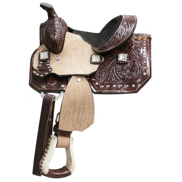 8" Double T pony saddle with floral tooled leather and crystal rhinestone conchos. This saddle is accented with silver and crystal studs on skirts.