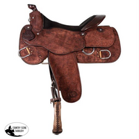 Gorgeous chocolate roughout leather is perfect for all day, everyday training, colt breaking or just a nice trail ride. Crafted with the finest hand selected hides and our own custom-made wooden trees that have been modified to fit today's modern conformations, from Arabians to Quarter Horses. We also offer a lifetime warranty on the tree. Latigo tie strap and cinch strap included. In-skirt rigging, and rawhide wrapped stirrups. The gullet measures 6 1/2". The saddle skirt measures 28 1/2" with a 16" drop. Weighs 33 lbs.