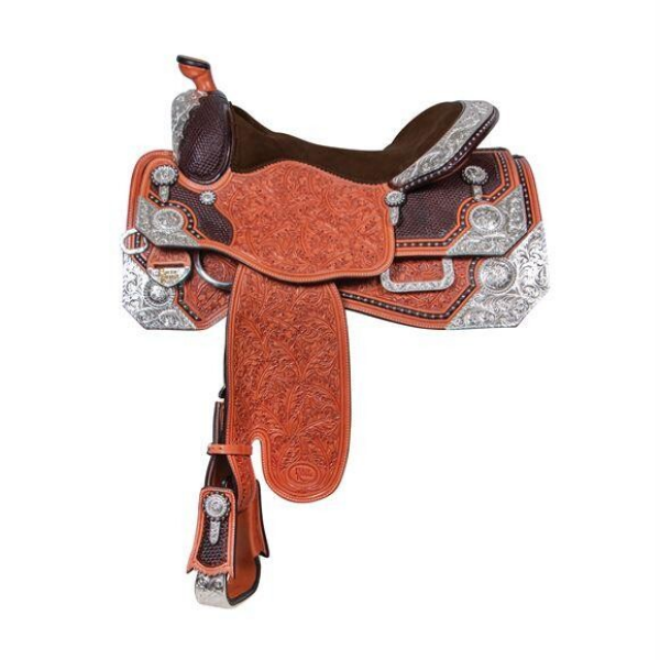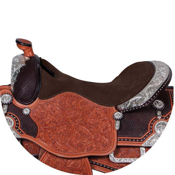 Crafted from the finest hand-selected hides, hand-tooled to perfection in a combination of fine basketweave and acorn leaf pattern, and complemented in light and dark with hand-engraved 92.5% sterling silver plate trim. Beautifully engraved silver tooling with the finest details and diagonal cut skirt front and rear skirt corners add the attention to detail required in a show saddle. Latigo cinch and off billet. All of Billy Royal® saddles are crafted with the finest hand-selected hides, on our own custom-made wooden trees that have been modified to fit today's modern conformations, from Arabians to Quarter Horses. Lifetime Warranty on the tree. Skirt length 29" x 16" drop, 6 1/2" gullet. Weighs 38 lbs.