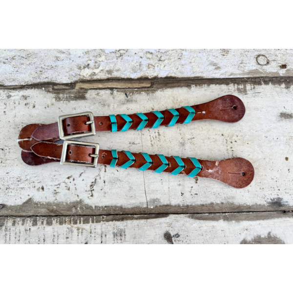 Showman Argentina cow leather braided ladies spur straps with accent leather braiding and buckles.