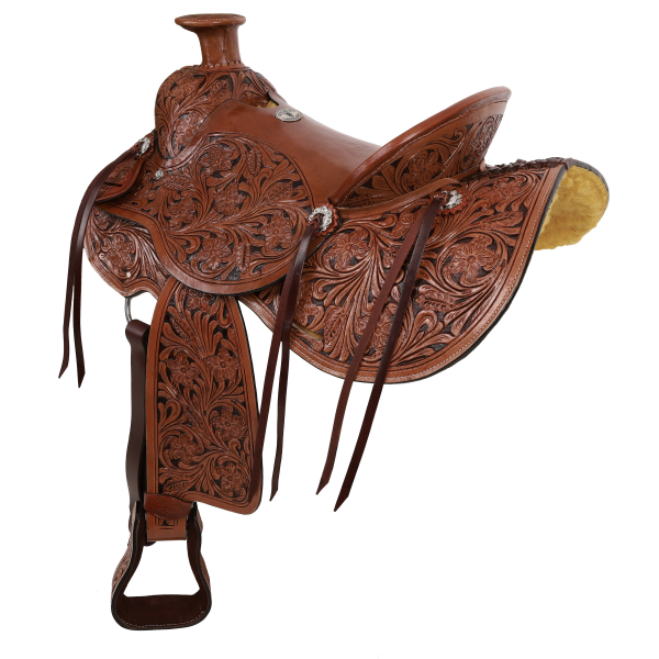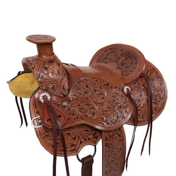 This 16-inch saddle is crafted from chestnut oiled leather and showcases intricate floral and leaf tooling that dances across its dark oil finish. The detailed artistry not only highlights the beauty of the leather but also adds a touch of elegance to every ride.