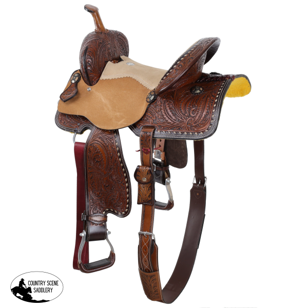 Designed with tan natural roughout jockeys, this saddle provides exceptional grip and control, ensuring a secure ride through tight turns and fast sprints. The cream-colored suede seat adds a touch of softness and contrast, complementing the overall aesthetic while enhancing rider comfort. The medium oiled leather pommel, cantle, skirt, and fenders are intricately tooled with a feather design, highlighted by a dark wash for extra depth and visual appeal.