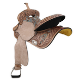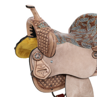 What truly sets this saddle apart is the intricate painted feather design on the skirt. The distressed teal feathers bring a sense of artistry and personality to the saddle, providing a striking visual contrast against the rich leather. The padded seat ensures a comfortable ride, whether you're competing or spending hours in the saddle. Copper berry conchos add a touch of elegance and complement the overall western aesthetic, while aluminum stirrups with leather grip tread offer added traction and stability for a secure ride. The saddle is completed with a leather off billet and tie strap, providing everything needed for a functional and stylish setup. Available in a 15-inch seat size, the saddle combines both beauty and performance for riders who want the best of both worlds.