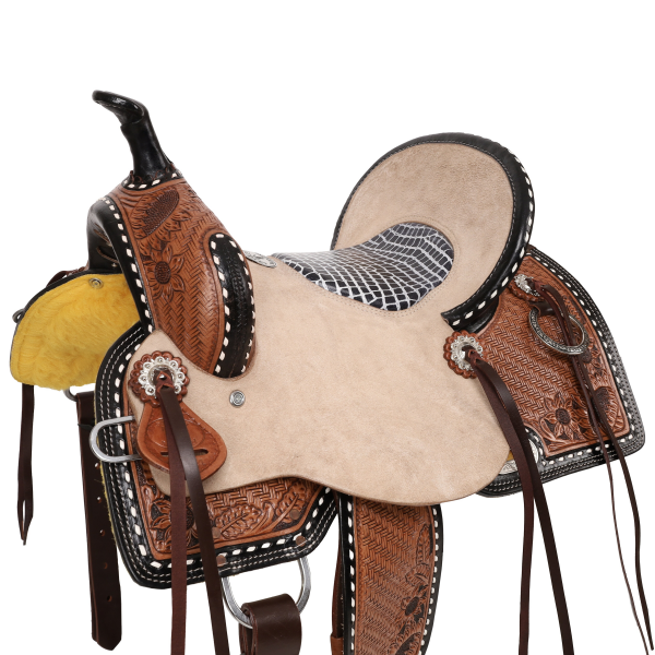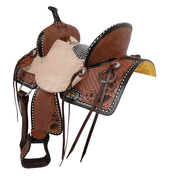 Get ready to ride in style with the Double T® Floral Weaves Barrel Style Saddle, a masterpiece of Western elegance and rugged functionality!